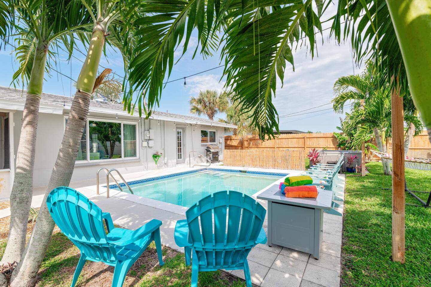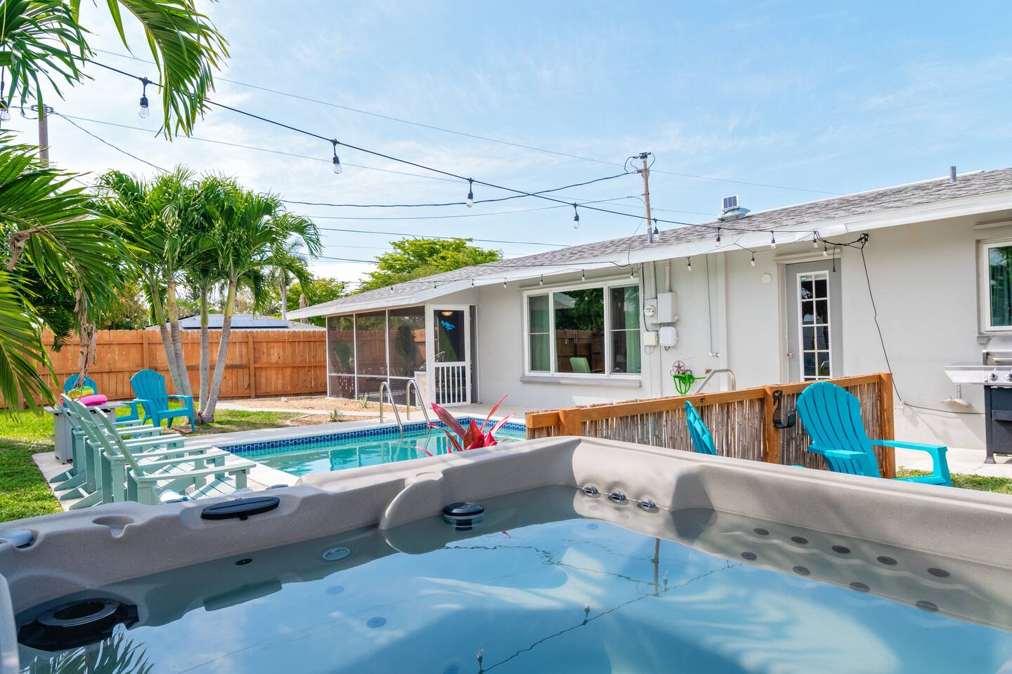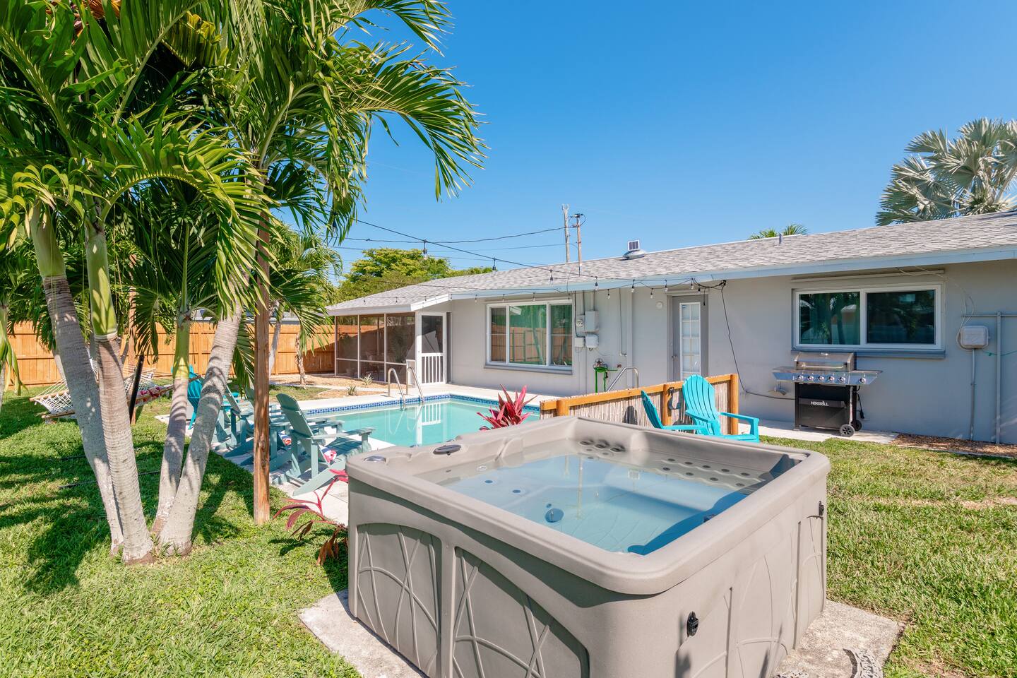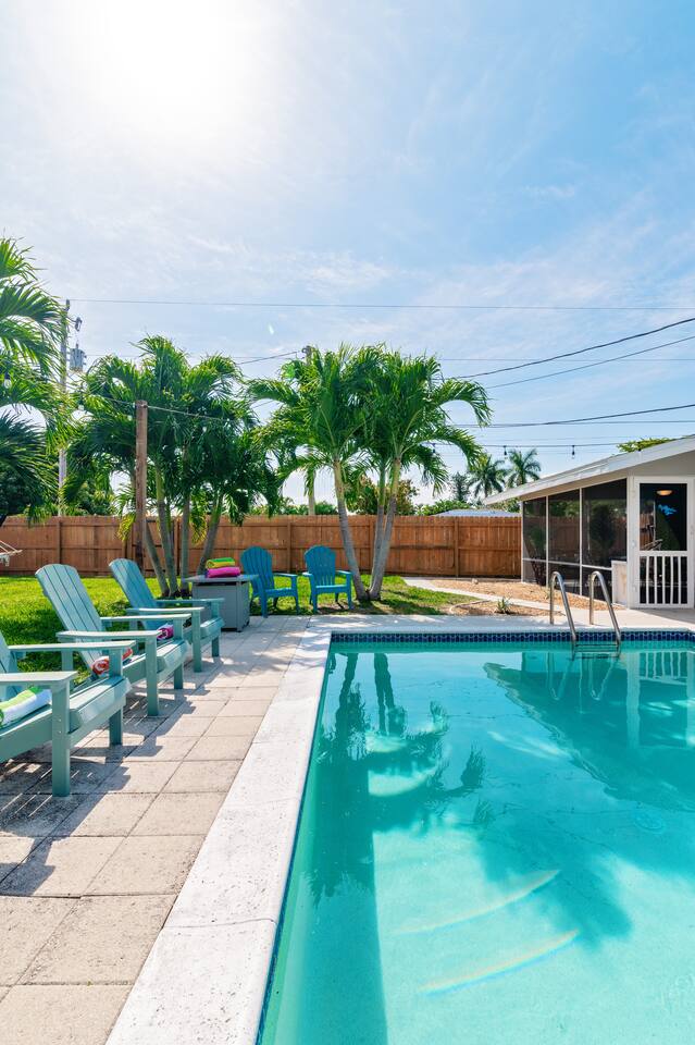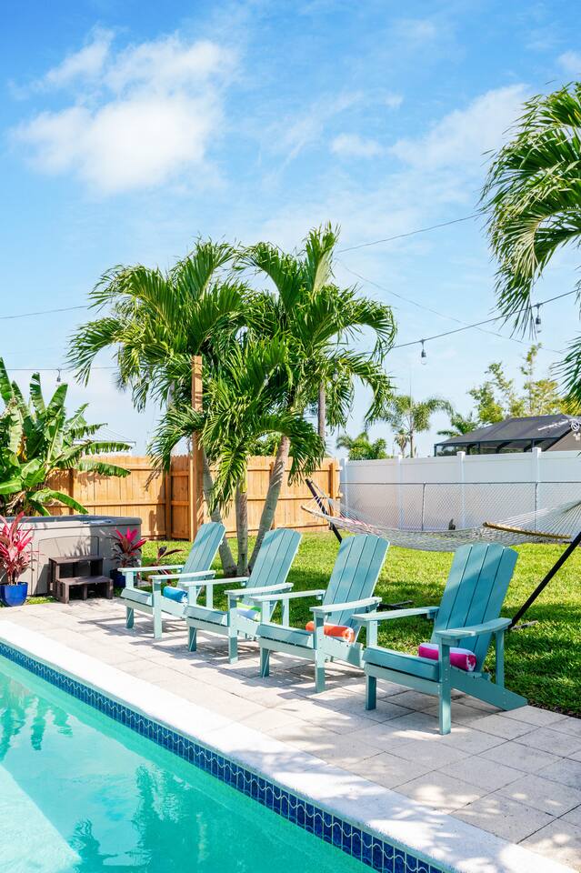 Welcome to your bright, modern launchpad for exploring Southwest Florida! Flooded with natural light, the airy, open-concept living space invites you to unwind the moment you arrive. Step outside to your personal paradise: a fully-fenced backyard featuring a sparkling pool, a relaxing hot tub, and a gas firepit perfect for evening conversations. Lounge in the hammock, sway in the swing chair, or enjoy a meal fresh off the Blackstone grill. As evening falls, the enclosed patio comes alive with the glow of string lights, creating the perfect ambiance. Sleeping Arrangements (Sleeps 6): - Master Bedroom: Queen-sized bed, TV, and an optional rollaway twin bed. - Spare Bedroom: Queen-sized bed with an XL twin trundle. Bathrooms: Two full-size bathrooms are available for your convenience. Entertainment & Recreation: The garage is your personal activity hub, packed with: - Beach Essentials: Boogie boards, umbrellas, wagon, cooler, and chairs. - Games: Ping-pong table, corn-hole, and darts. - Water Sports: Two kayaks with life jackets. - Local Exploration: Two beach cruiser bikes with helmets.
