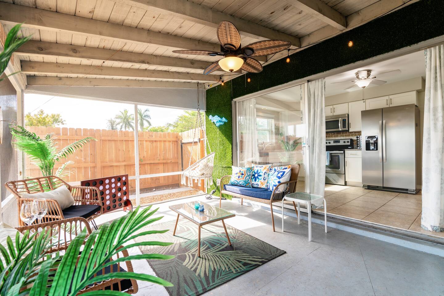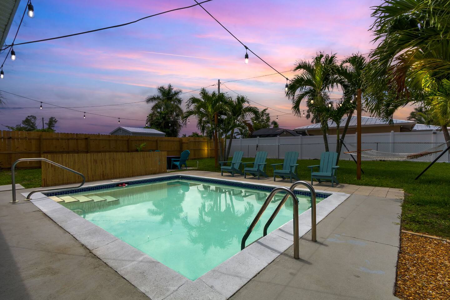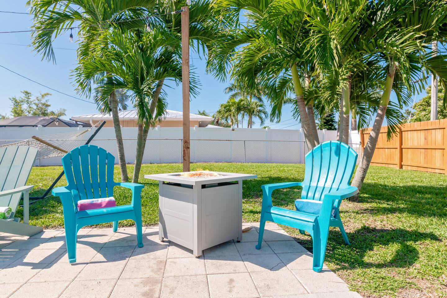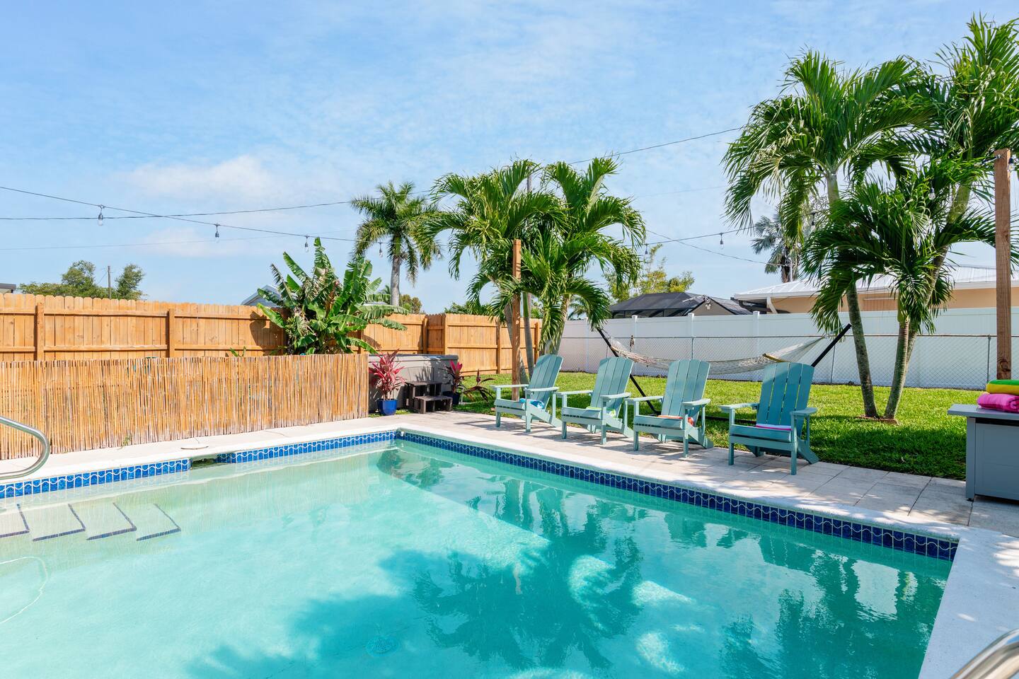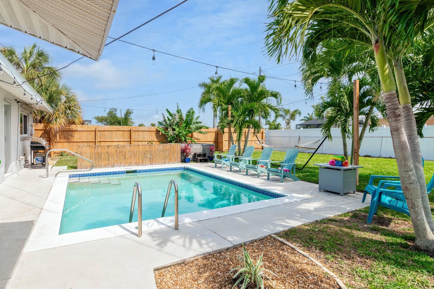 Welcome to your bright, modern launchpad for exploring Southwest Florida! Flooded with natural light, the airy, open-concept living space invites you to unwind the moment you arrive. Step outside to your personal paradise: a fully-fenced backyard featuring a sparkling pool, a relaxing hot tub, and a gas firepit perfect for evening conversations. Lounge in the hammock, sway in the swing chair, or enjoy a meal fresh off the Blackstone grill. As evening falls, the enclosed patio comes alive with the glow of string lights, creating the perfect ambiance. Sleeping Arrangements (Sleeps 6): - Master Bedroom: Queen-sized bed, TV, and an optional rollaway twin bed. - Spare Bedroom: Queen-sized bed with an XL twin trundle. Bathrooms: Two full-size bathrooms are available for your convenience. Entertainment & Recreation: The garage is your personal activity hub, packed with: - Beach Essentials: Boogie boards, umbrellas, wagon, cooler, and chairs. - Games: Ping-pong table, corn-hole, and darts. - Water Sports: Two kayaks with life jackets. - Local Exploration: Two beach cruiser bikes with helmets.