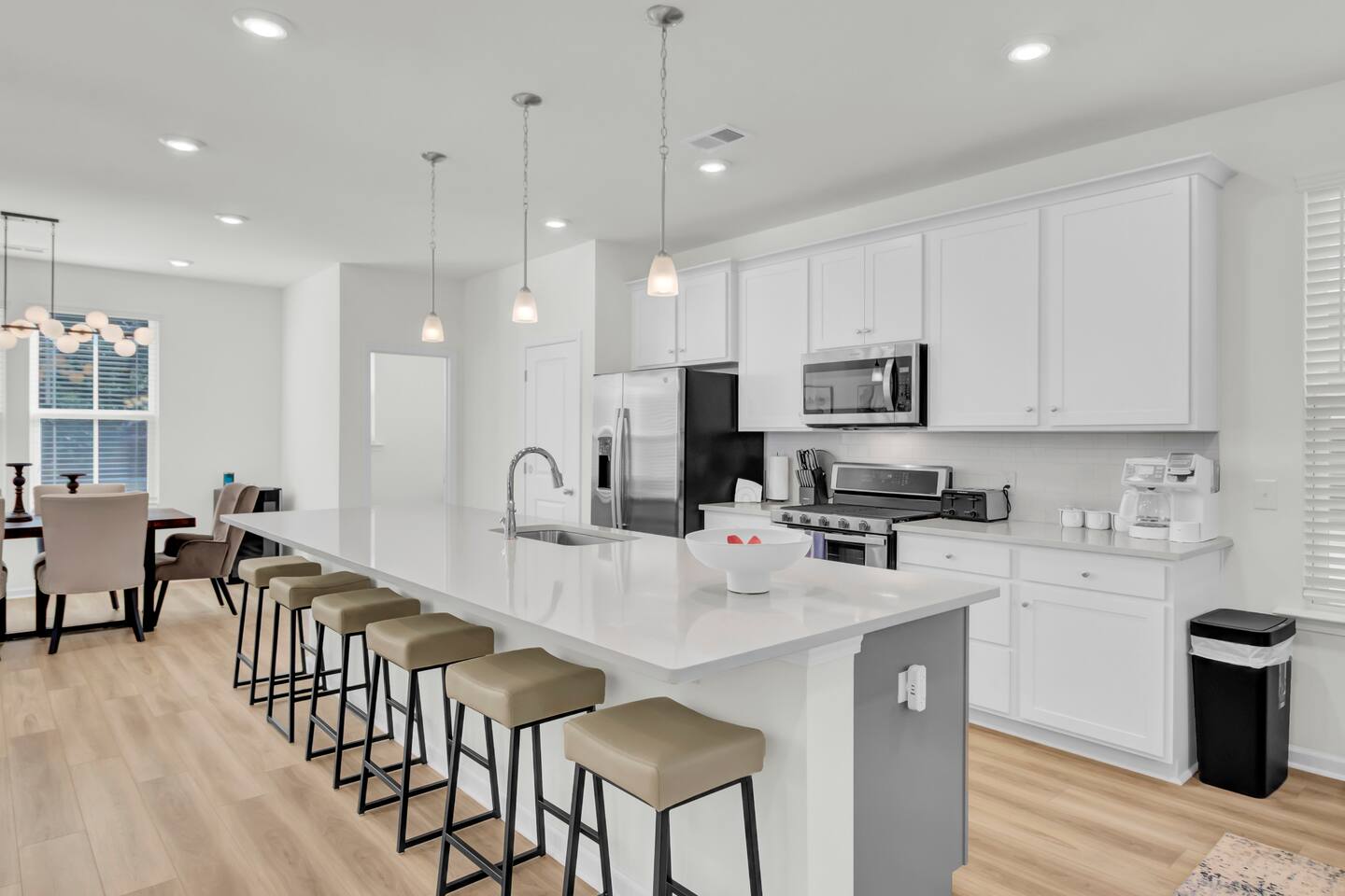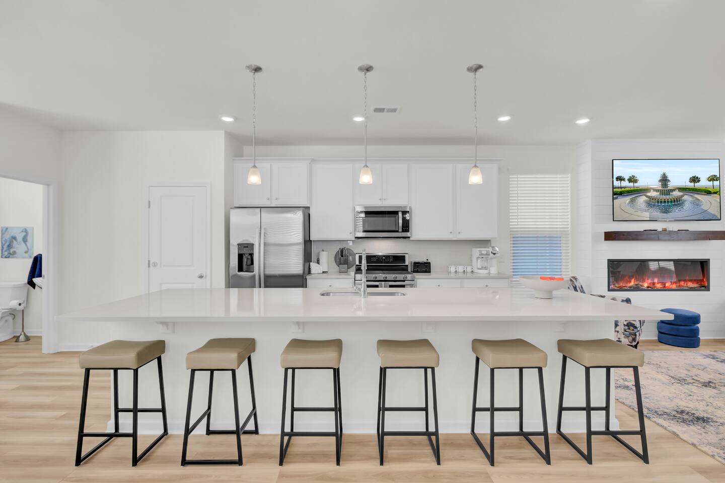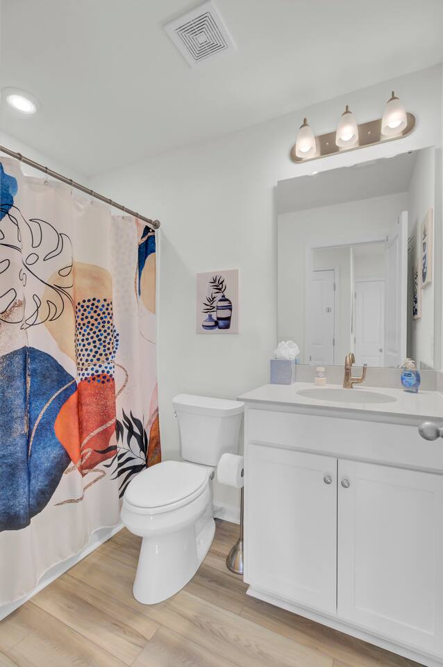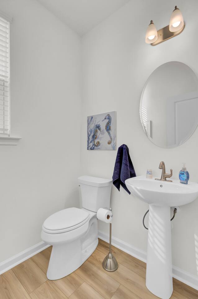 Step into a bright, modern retreat designed for comfort and connection. The second-floor main living area is a spacious open-plan concept, perfect for gathering. Key Features: Living Area: Relax by the cozy fireplace in the open and airy living room. Kitchen: A fully stocked kitchen with a large quartz island, perfect for preparing home-cooked meals. Dining: A dedicated dining area to enjoy meals together. Outdoor Space: Unwind on the screened-in porch or enjoy the large, fully fenced-in backyard. With four bedrooms and 3.5 bathrooms spread across three floors, your group of up to 10 will have plenty of room. For convenience, one bedroom and a full bathroom are located on the first floor. Sleeping Arrangements: Bedroom 1: King Bed with TV Bedroom 2: King Bed with TV Bedroom 3: Queen Bed with TV Bedroom 4: Full-over-Queen Bunk Bed with TV