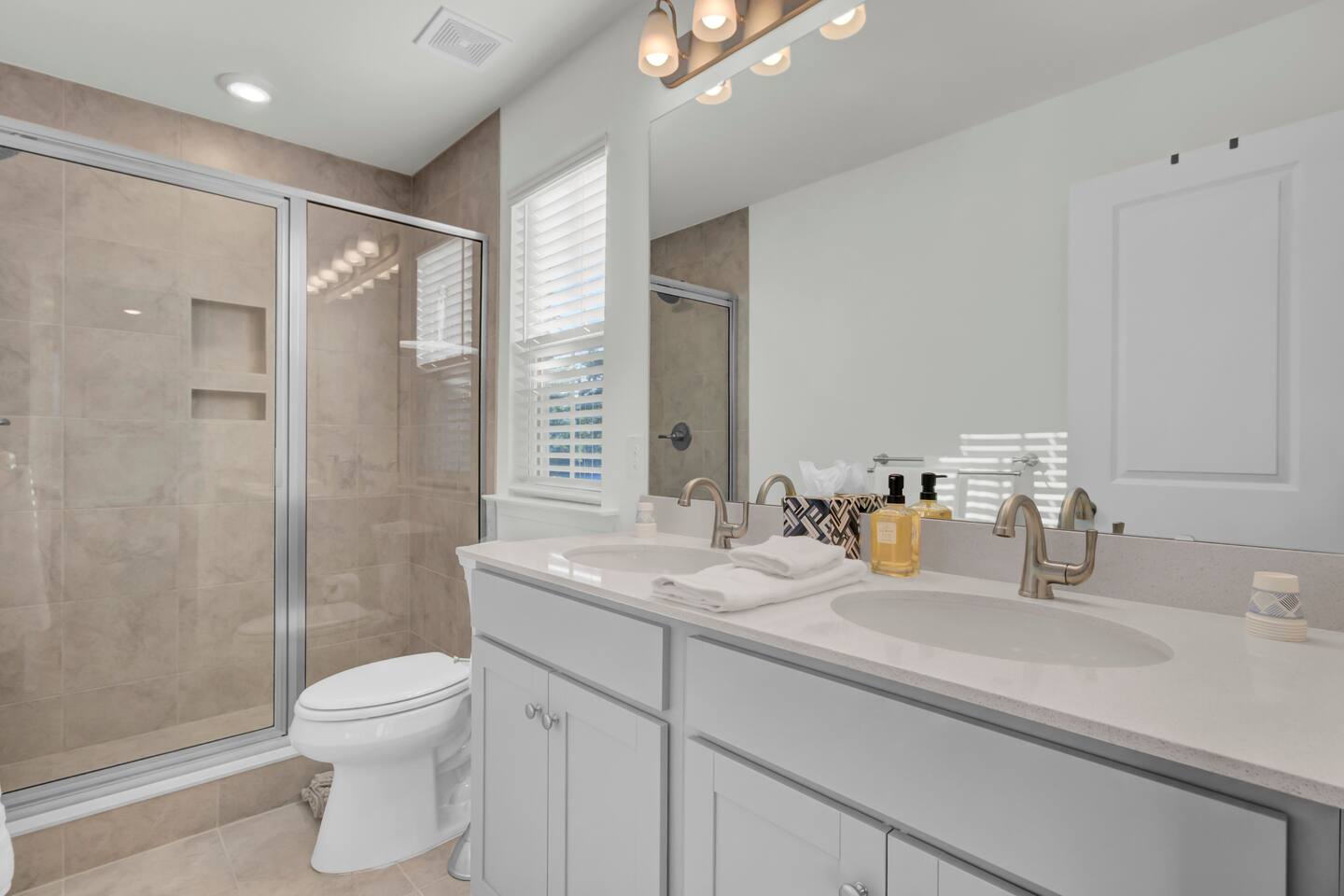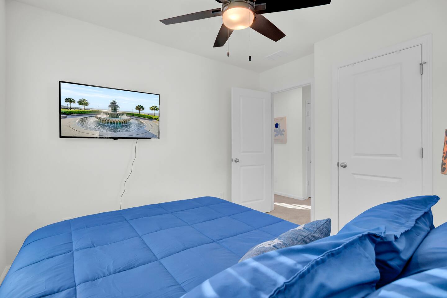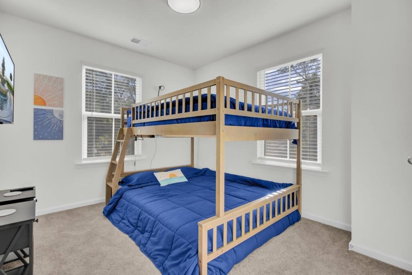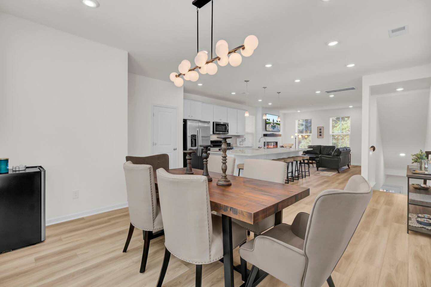 Step into a bright, modern retreat designed for comfort and connection. The second-floor main living area is a spacious open-plan concept, perfect for gathering. Key Features: Living Area: Relax by the cozy fireplace in the open and airy living room. Kitchen: A fully stocked kitchen with a large quartz island, perfect for preparing home-cooked meals. Dining: A dedicated dining area to enjoy meals together. Outdoor Space: Unwind on the screened-in porch or enjoy the large, fully fenced-in backyard. With four bedrooms and 3.5 bathrooms spread across three floors, your group of up to 10 will have plenty of room. For convenience, one bedroom and a full bathroom are located on the first floor. Sleeping Arrangements: Bedroom 1: King Bed with TV Bedroom 2: King Bed with TV Bedroom 3: Queen Bed with TV Bedroom 4: Full-over-Queen Bunk Bed with TV